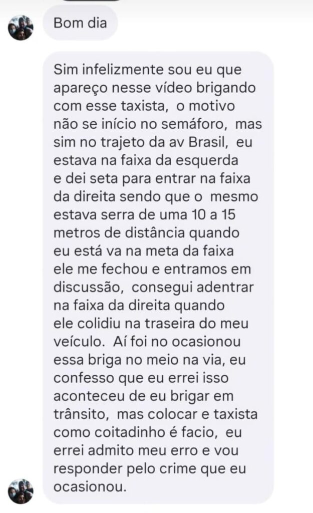 O agressor foi identificado como Kaio Damasceno, que entrou em contato com a reportagem do Portal CM7 Brasil para prestar esclarecimentos. Em sua versão, Kaio afirma que o conflito não começou no semáforo, mas alguns metros antes, ainda na Avenida Brasil. Segundo ele, tentou trocar de faixa com a seta acionada quando o taxista, que estaria entre 10 e 15 metros de distância, supostamente o fechou de forma proposital, resultando em uma colisão traseira. O desentendimento, então, evoluiu para a agressão.
