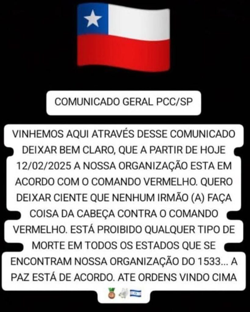 12/02/2025 A NOSSA ORGANIZAÇÃO ESTÁ EM ACORDO COM O COMANDO VERMELHO. QUERO DEIXAR CIENTE QUE NENHUM IRMÃO (A) FAÇA COISA DA CABEÇA CONTRA O COMANDO VERMELHO. ESTÁ PROIBIDO QUALQUER TIPO DE MORTE EM TODOS OS ESTADOS QUE SE ENCONTRAM NOSSA ORGANIZAÇÃO DO 1533… A PAZ ESTÁ DE ACORDO. ATÉ ORDENS VINDO CIMA”