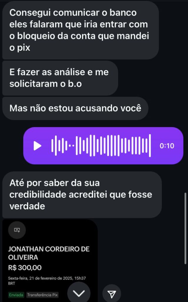 Com o controle das contas, os criminosos começaram a enganar seguidores de Kely, solicitando dinheiro e promovendo falsas campanhas. Pelo menos uma pessoa já caiu no golpe e transferiu R$ 300,00 para os fraudadores.