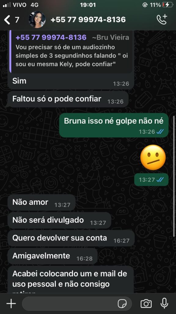 No entanto, a abordagem logo levantou suspeitas. A golpista exigiu que Kely gravasse um vídeo seguindo um roteiro específico, algo incomum em negociações reais. Após enviar o vídeo, a fraudadora solicitou também um áudio com a mesma fala, o que fez Kely desconfiar. Ao questionar se se tratava de um golpe, ela imediatamente perdeu o acesso às suas contas no Instagram e no e-mail.