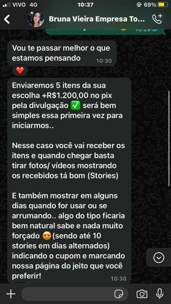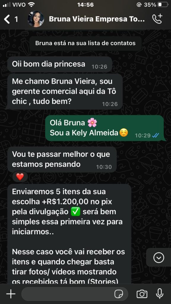 Kely recebeu uma mensagem no Instagram de uma suposta gerente comercial chamada Bruna Vieira, que alegava representar a loja “Tô Chic”. A proposta parecia atrativa: o envio de cinco peças de roupa e um pagamento de R$ 1.200,00 via Pix em troca de divulgação nas redes sociais.