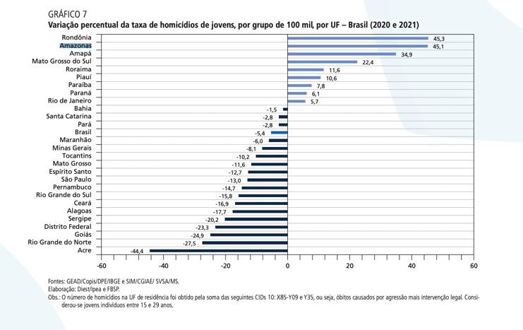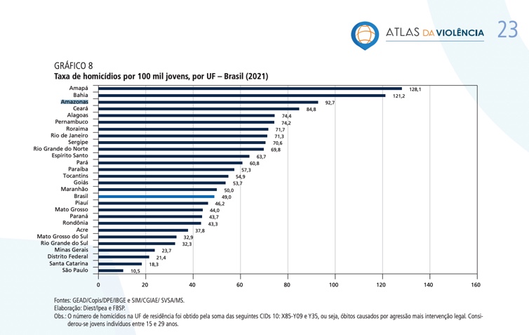 Os dados alarmantes revelados pelo Anuário do Fórum Brasileiro de Segurança Pública indicam que o Amazonas ocupa o terceiro lugar no Ranking Nacional de Mortes Violentas Intencionais (MVI), com uma taxa de 38,8 por 100 mil habitantes, quase o dobro da média nacional. A capital, Manaus, encontra-se na lista das 50 cidades mais violentas, com uma taxa de 53,4 mortes por 100 mil pessoas, ocupando 3º lugar no ranking das capitais mais violentas do Brasil. Além disso, o estado do Amazonas também apareceu entre os três Estados com as maiores taxas de homicídios do país. Uma situação que evidencia a urgência de medidas eficazes para conter a escalada da criminalidade que transformou a cidade em um verdadeiro faroeste a céu aberto.