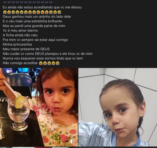 Nas redes sociais, o pai biológico e a mãe da menina entraram em luto. “Eu ainda não estou acreditando que você me deixou. Deus ganhou mais um anjinho ao seu lado e o céu mais uma estrelinha brilhante. Mas eu perdi uma grande parte de mim. Você é meu amor eterno. A ficha ainda não caiu. Para mim, você sempre vai estar aqui comigo, minha princesinha, meu maior presente de Deus. Não cuidei de você como Deus planejou, e ele tirou você de mim. Nunca vou esquecer esse sorriso lindo que você tem. Não consigo acreditar”, disse o pai da menina.