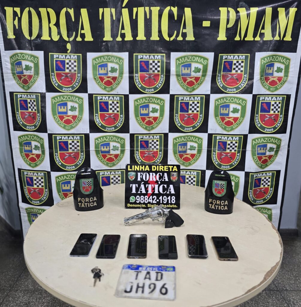Durante a abordagem, um dos suspeitos foi encontrado com um simulacro de arma de fogo e vários celulares, entre eles o aparelho da vítima. O outro suspeito também foi detido.