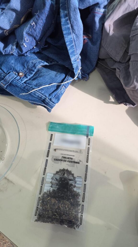 De acordo com o delegado Rodrigo Monfroni, durante a fiscalização de materiais destinados aos presos custodiados na carceragem, a equipe policial localizou porções de maconha e papel de seda escondidos entre as costuras de duas bermudas.