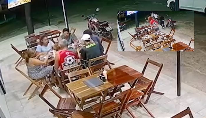As imagens capturadas mostram o momento em que os dois criminosos abordaram seis clientes na área externa da lanchonete. A ação rápida e agressiva dos assaltantes levou pânico ao local, forçando os clientes a se dirigirem para dentro do estabelecimento após ameaças.