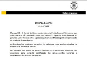 Polícia – A Polícia Federal divulgou neste domingo (19) que identificou oito pessoas envolvidas na morte do indigenista Bruno Pereira e do jornalista Dom Phillips, sendo que três estão presos e cinco foram identificados por terem participado da ocultação dos cadáveres. Os presos são Amarildo da Costa Pereira, conhecido como Pelado, Jefferson da Silva Lima e Oseney da Costa de Oliveira, conhecido como Dos Santos. Até o momento, apenas Amarildo confessou o crime.