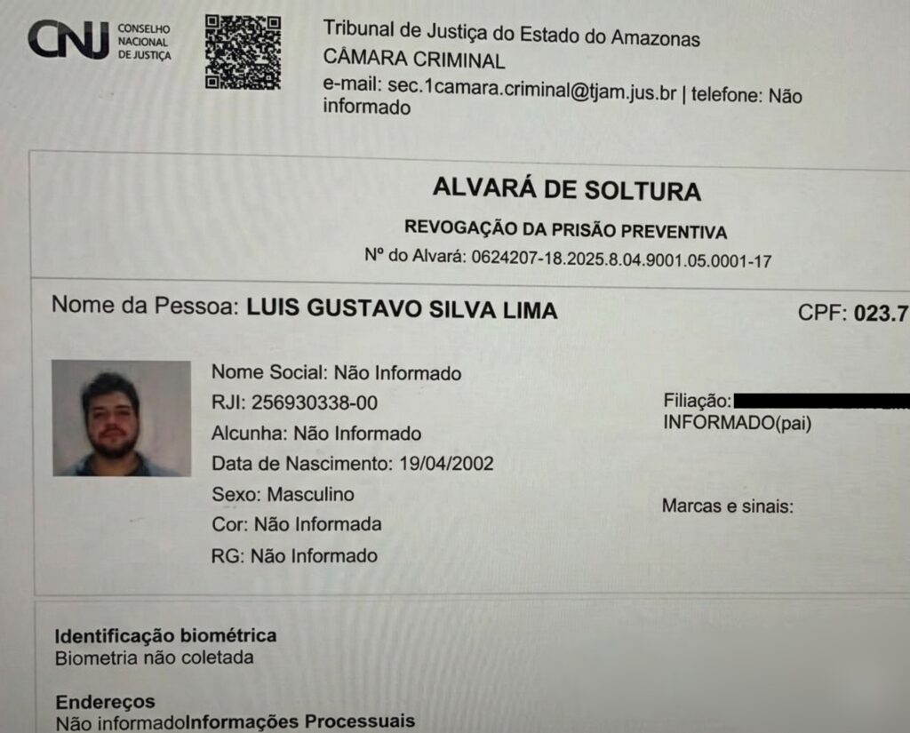 Manaus – O Tribunal de Justiça do Amazonas (TJAM) concedeu, por meio da sua Câmara Criminal, o alvará de soltura para Luis Gustavo Silva Lima, de 23 anos. Conhecido como o “Playboy da Amarok”, ele é um dos principais réus no caso do racha que resultou na morte de duas pessoas e deixou outras quatro feridas na Avenida do Turismo, em 16 novembro de 2025.