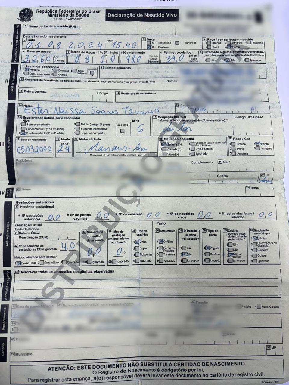Neste documento o nome do bebê recém-nascido estava em branco, enquanto o de Ester aparecida como o da mãe da criança.