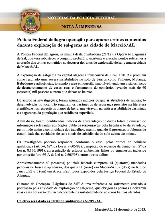 O comunicado oficial da Polícia Federal destaca que a investigação busca esclarecer não apenas as irregularidades na exploração do sal-gema, mas também as responsabilidades quanto aos danos ambientais e sociais causados. A ação revela a importância da fiscalização rigorosa em atividades extrativas para garantir a segurança das comunidades locais e a preservação do meio ambiente.