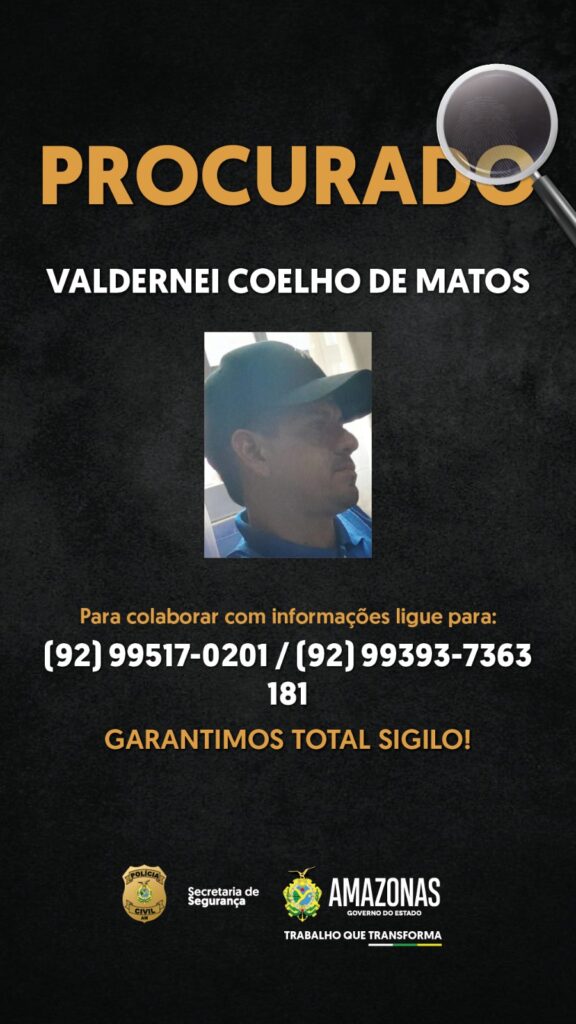 A PC-AM ressalta a quem tiver conhecimento sobre o paradeiro de Valdernei Coelho de Matos, que repasse as informações aos números (92) 99517-0201 e (92) 99393-7363, da DEP de Manacapuru, ou 181, disque-denúncia da Secretaria de Segurança Pública (SSP-AM).