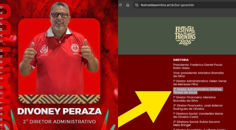 O Portal CM7 Brasil teve acesso à relação oficial da diretoria do Boi Garantido em 2026, que confirma Divoney Perasa de Souza como presidente administrativo. Ele continua ocupando o cargo mesmo após a repercussão do caso.