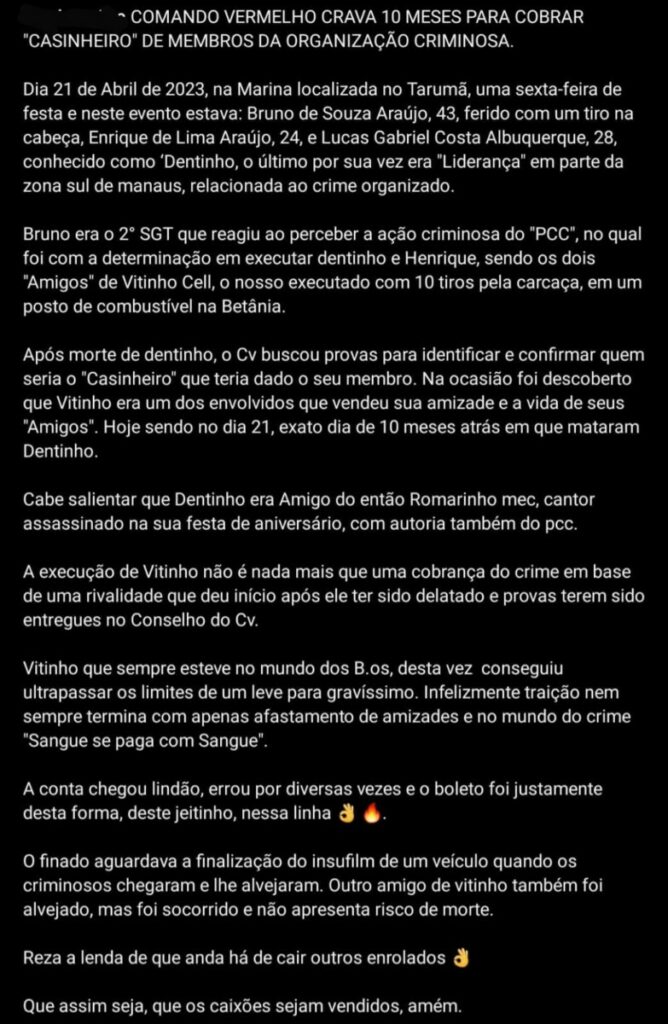Desta vez, a versão é de que Vitinho Cell foi executado porque teria criado uma “casinha” para os próprios amigos, que levou à morte de “Dentinho” em 2023.