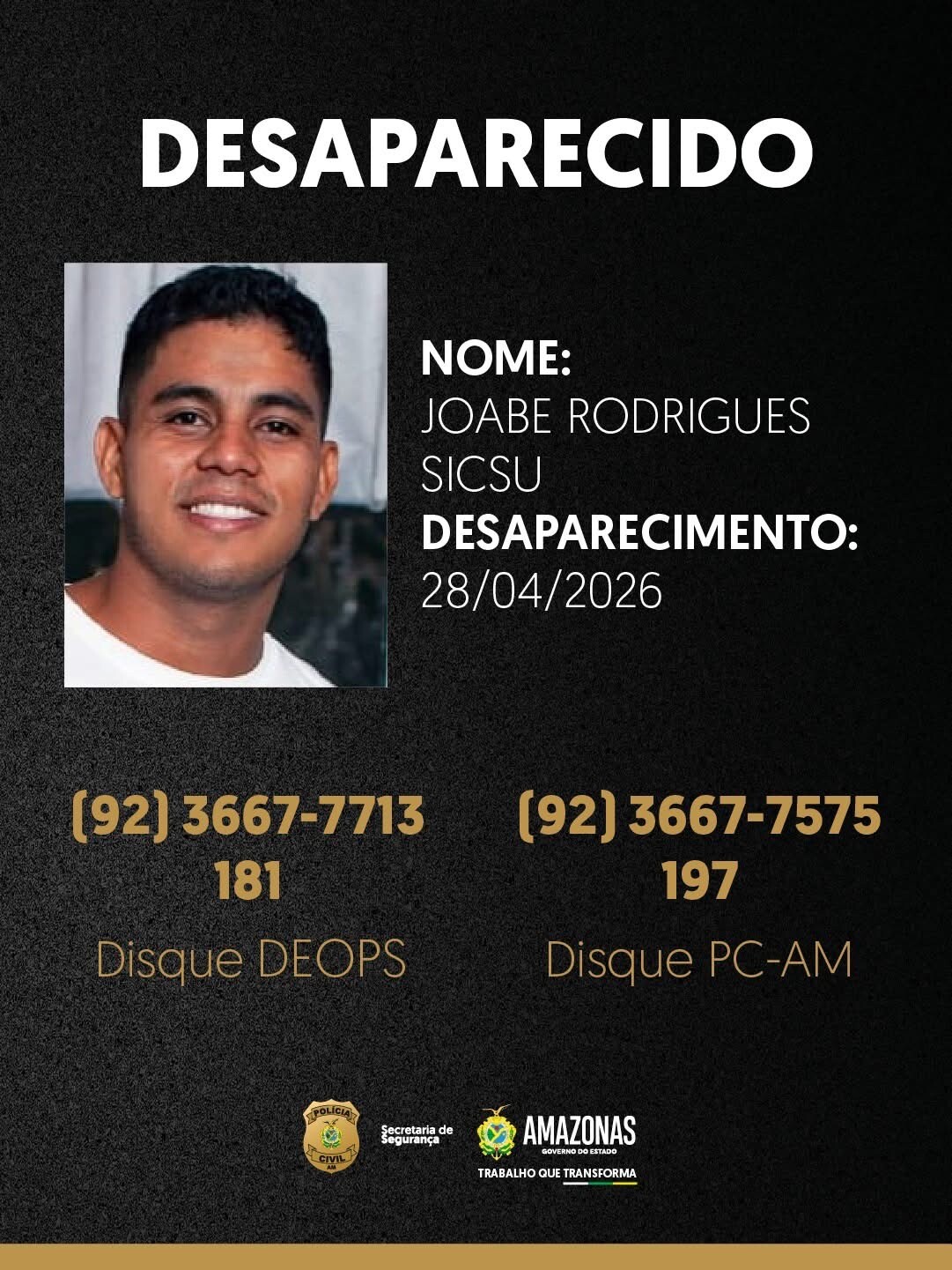 Manaus – A Polícia Civil do Amazonas divulgou a imagem de Joabe Rodrigues Sicsu, de 29 anos, que está desaparecido desde a última terça-feira (28). O caso é acompanhado pela Delegacia Especializada em Ordem Política e Social.