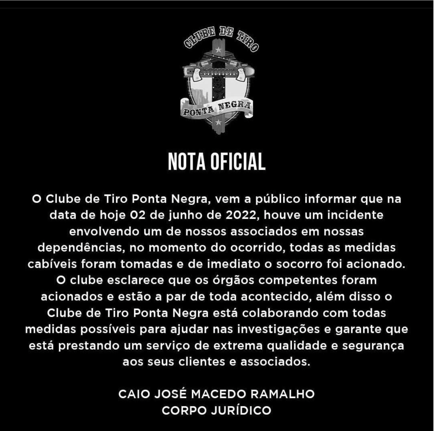 Em nota, o clube de tiro classificou o ocorrido como ‘incidente’. O caso será investigado pela Polícia Civil.