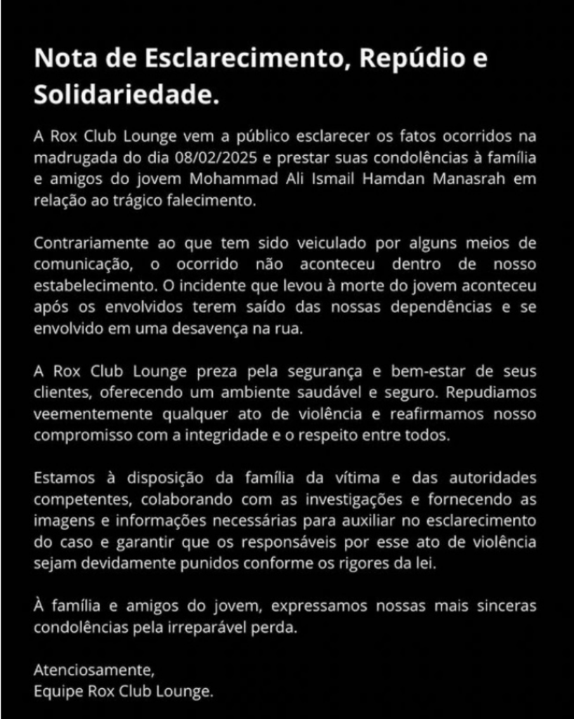 A casa noturna Rox Club Lounge se manifestou por meio de uma nota oficial e afirmou que o ocorrido não aconteceu dentro do estabelecimento.