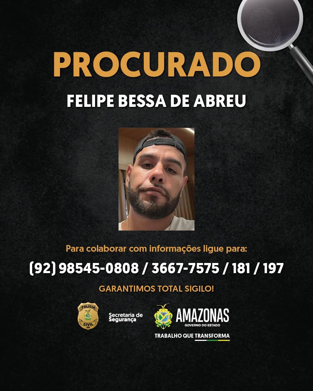 A PC-AM solicita a quem tiver informações sobre o paradeiro de Felipe Bessa de Abreu que entre em contato pelos números (92) 98545-0808, da DECCM/Centro-Sul, 197 e (92) 3667-7575, da Polícia Civil; ou pelo 181, da Secretaria de Segurança Pública do Amazonas (SSP-AM). “A identidade do informante ficará em sigilo”, afirmou a delegada.https://www.policiacivil.am.gov.br/?p=23920