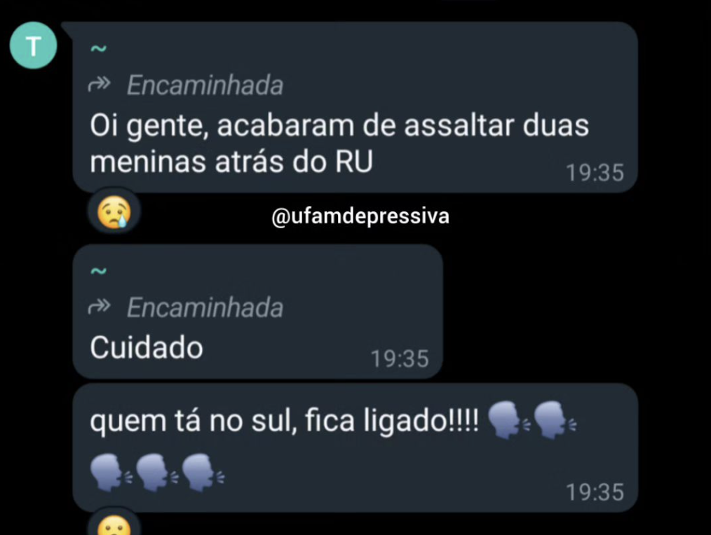 “Oi gente, acabaram de assaltar duas meninas atrás do RU. Quem tá no sul (minicampus), fica ligado!”, alertou uma estudante nas redes sociais, destacando a insegurança que tomou conta da área.