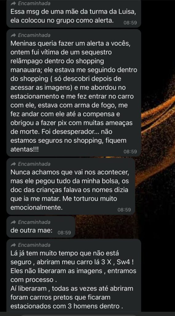 Em relatos enviados via WhatsApp, a mulher descreveu os momentos de pânico e agressão. Ela contou que foi forçada a entrar no carro do criminoso, que, sob ameaça de morte, obrigou-a a realizar transferências de dinheiro via PIX.