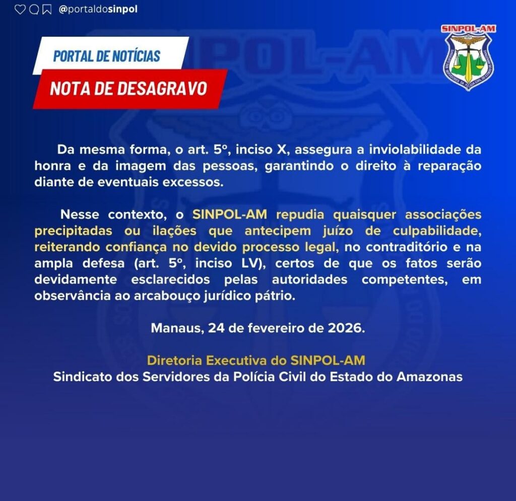 Nesse contexto, o SINPOL-AM repudia quaisquer associações precipitadas ou ilações que antecipem juízo de culpabilidade, reiterando confiança no devido processo legal, no contraditório e na ampla defesa (art. 5°, inciso LV), certos de que os fatos serão devidamente esclarecidos pelas autoridades competentes, em observância ao arcabouço jurídico pátrio.
