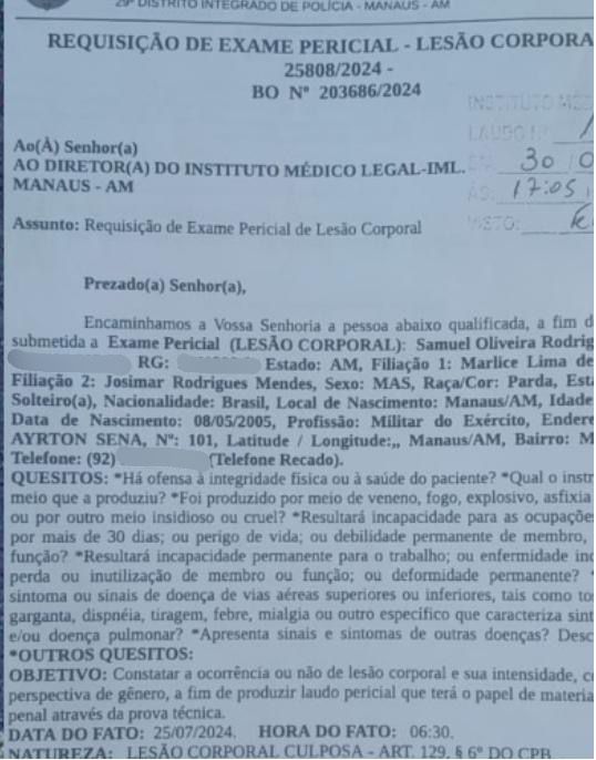Manaus – Samuel Rodrigues, 19, foi agredido no dia 25 de julho, de acordo com os pais. O jovem é soldado do Exército Brasileiro, e é lotado no 2º Grupamento de Engenharia, que fica localizado no bairro Ponta Negra, zona Oeste de Manaus.