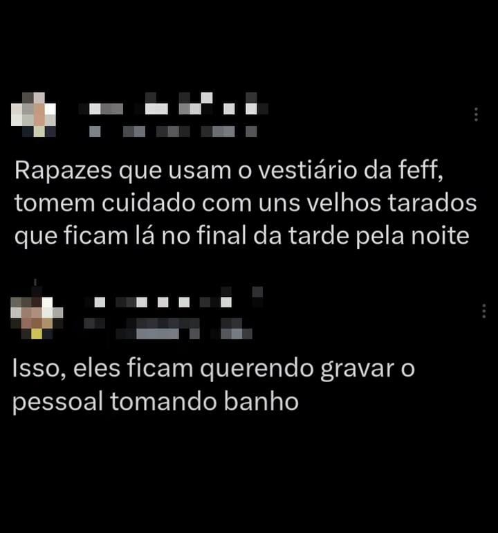 “Rapazes que usam o vestiário da FEFF, tomem cuidado com uns velhos tarados que ficam lá no final da tarde pela noite”, alertou um dos alunos nos grupos de mensagens. Outro estudante acrescentou: “Eles ficam querendo gravar o pessoal tomando banho.”