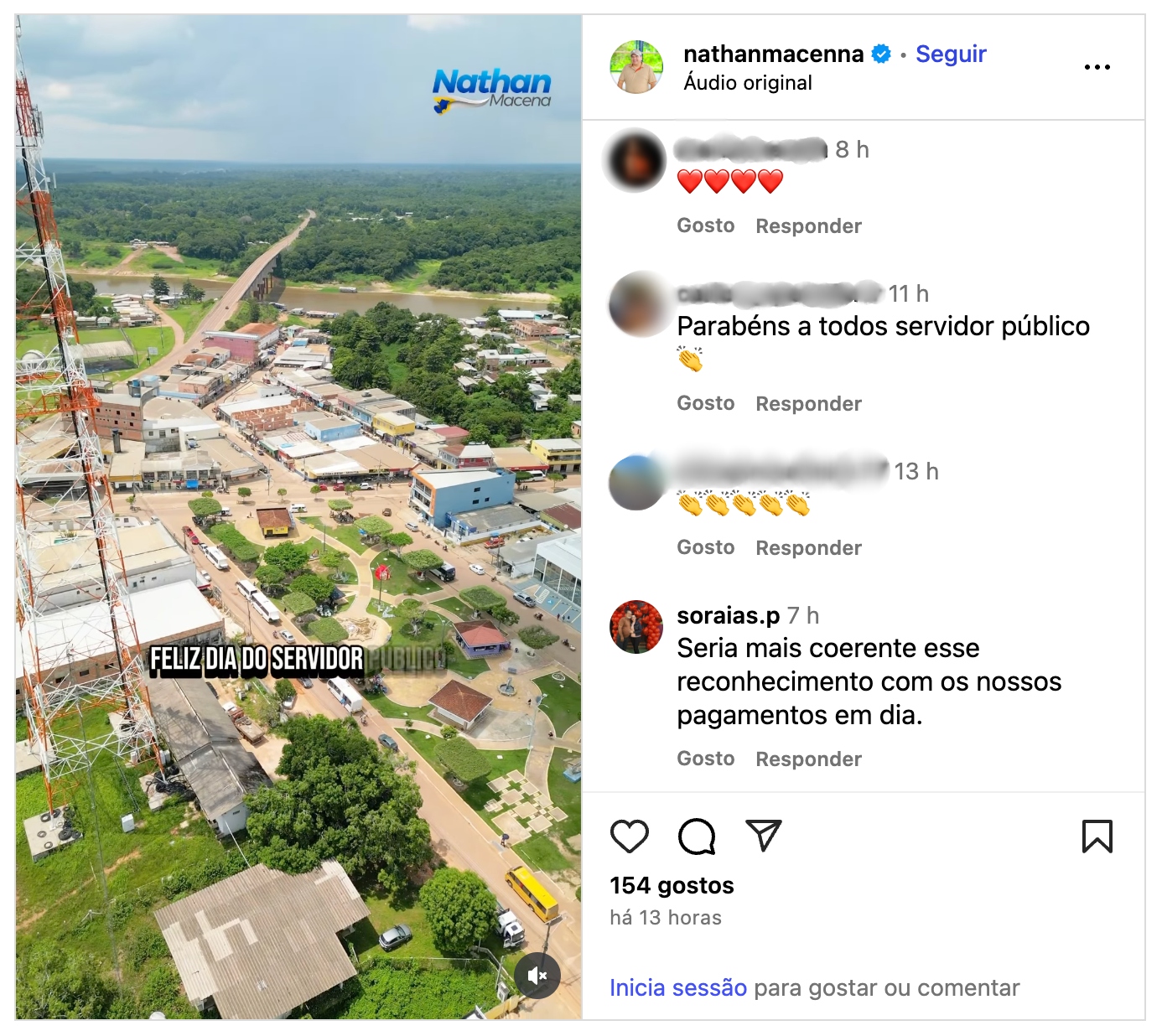 Apesar da crise, o secretário Nathan Macena publicou, nesta terça-feira (28), uma mensagem nas redes sociais parabenizando a prefeita Mara Alves e os servidores pelo Dia do Servidor Público. A publicação gerou reação entre os internautas. Uma mulher identificada como Soraya comentou que a homenagem seria mais coerente se os pagamentos estivessem em dia, refletindo a indignação dos trabalhadores.
