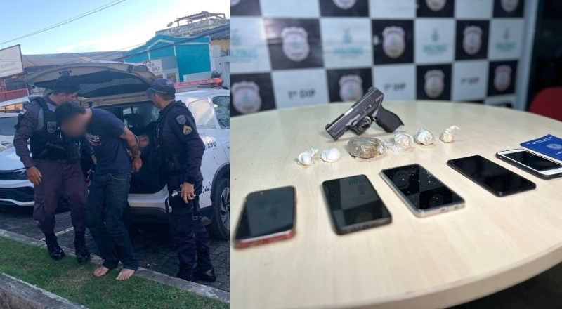 Durante a abordagem, os policiais encontraram cinco celulares, além de um simulacro de arma de fogo, porções de entorpecentes e uma carteira de trabalho que estava com um dos suspeitos.