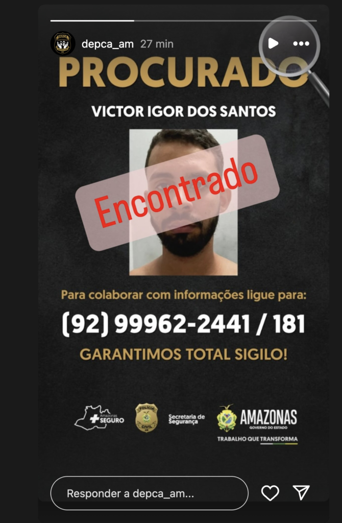 “Com base nas provas colhidas durante as investigações, a Justiça do Amazonas decretou novamente a prisão de Rodrigo Wenderson e Victor Igor”, afirmou a delegada Juliana Tuma, titular da Depca.