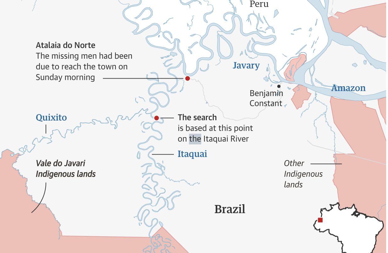 O jornalista britânico Dom Phillips e o servidor da Funai (Fundação Nacional do Índio), Bruno Araújo Pereira, desapareceram após uma visita à Terra Indígena do Vale do Javari que fica localizado no estado do Amazonas. O território tem sofrido com invasões de caçadores, pescadores e madeireiros.