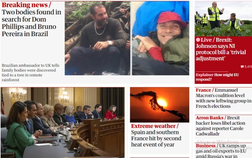 Amazonas — O jornal inglês The Guardian informou na primeira pagina desta segunda-feira (13), que os corpos de Dom Phillips e do indigenista Bruno Pereira foram encontrados amarrados em uma árvore durante as buscas.