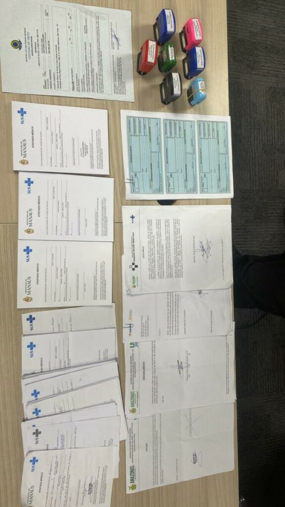 Manaus – Uma operação conjunta, denominada “Calvário”, deflagrada pelo 1° Distrito Integrado de Polícia resultou na prisão de um grupo criminoso responsável por falsificar e comercializar atestados médicos e certidões de óbito em Manaus. A ação, que ocorreu na última sexta-feira (22/3), levou à detenção em flagrante pelos crimes de associação criminosa, falsificação de documentos públicos e particulares, estelionato e falsidade ideológica dos nacionais Kerolen Carvalho de Souza, Adrya Santos Coutinho, Sandro da Silva Costa e Gabriel Ferreira da Rocha.
