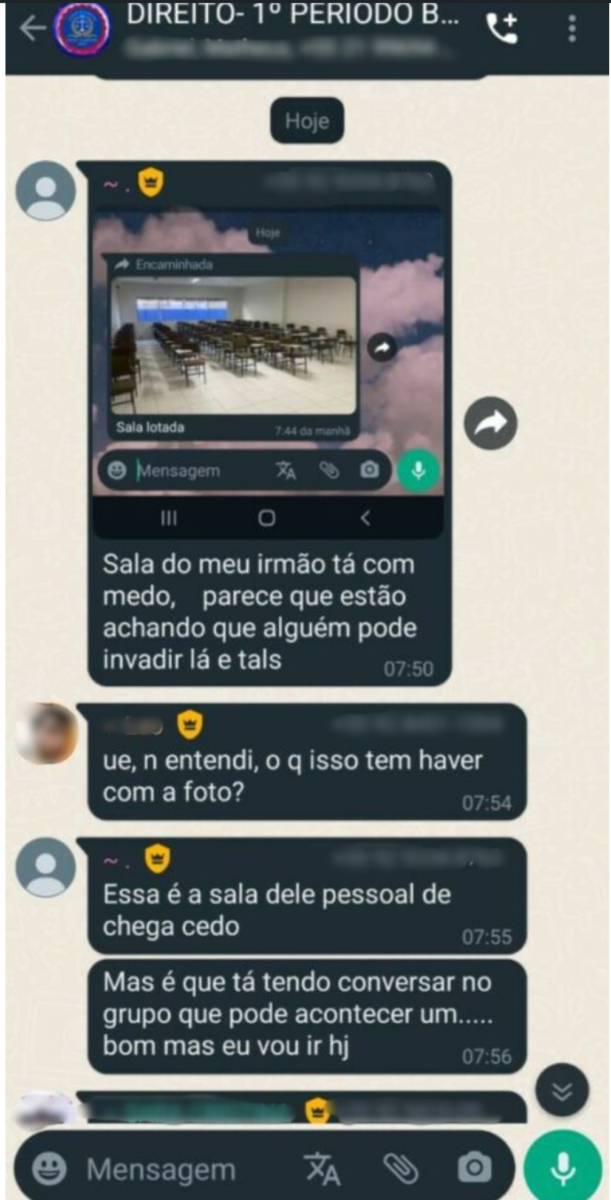 Segundo informações de estudantes, as mensagens contendo ameaças foram enviadas em grupos da faculdade e rapidamente se espalharam, junto com a imagem de um revólver.