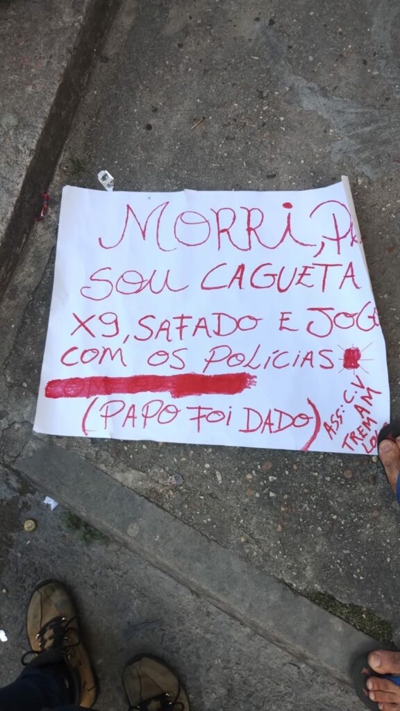 Ao lado do corpo do homem foi deixado um recado alegando que o mesmo foi assassinado porque era “cagueta e X9” e ”fechava com a Polícia”.