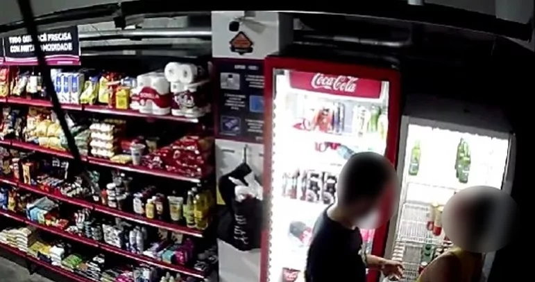 O circuito de segurança do local flagrou três idas até o mercadinho. As imagens mostram dois homens recolhendo produtos à 0h59 e às 6h58 e 8h45.