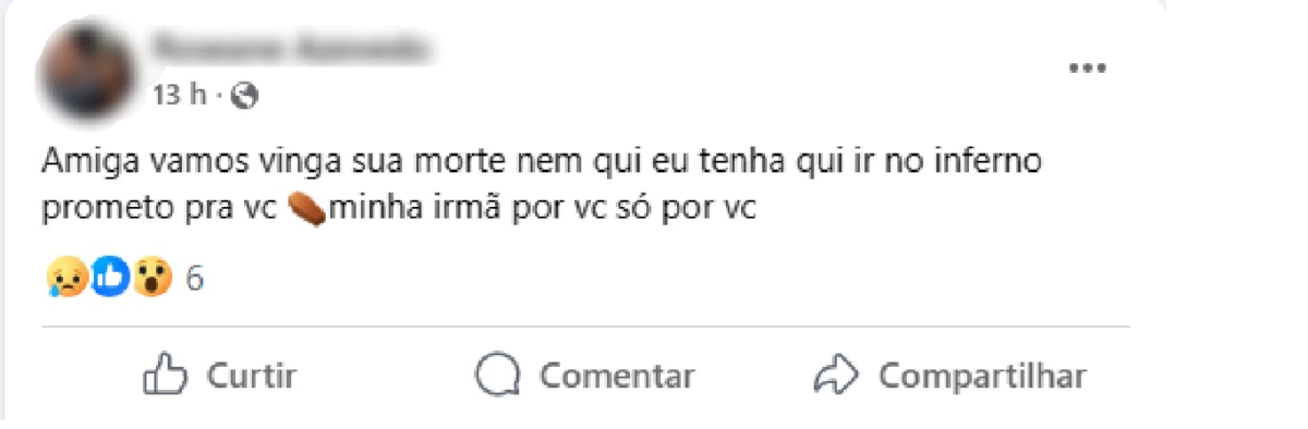 Amigas de Thaandra expressaram sua revolta diante da perda, com uma delas fazendo uma promessa impactante de vingança. “Amiga, vamos vingar sua morte, nem que eu tenha que ir ao inferno. Prometo para você, minha irmã, por você, só por você.”