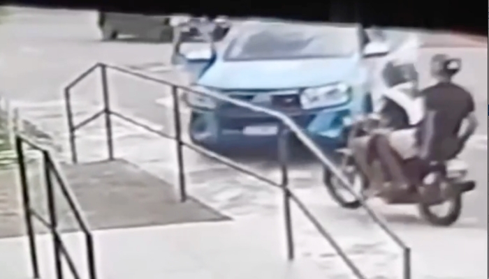 O vídeo mostra que o bandido seguia com um comparsa em uma moto quando uma viatura do 37º Batalhão da Polícia Militar, com sede em Resende (RJ), mandou que os dois parassem.