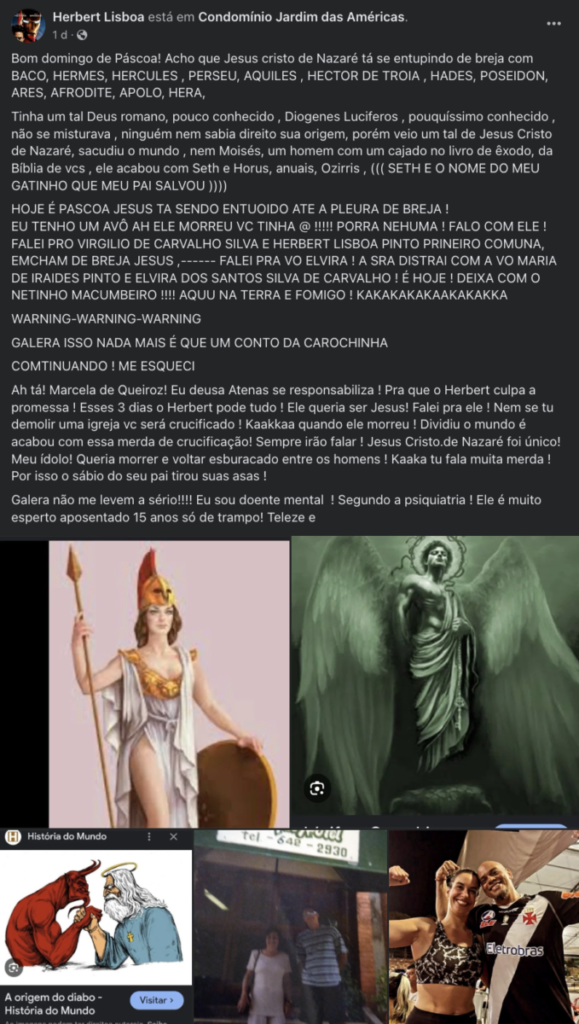 Mas quem é Hebert Lisboa Pinto Neto? Nascido no Rio de Janeiro, o homem é um bombeiro militar da reserva, mas suas ações recentes chamam a atenção para possíveis problemas psicológicos. Em suas redes sociais, há indícios de transtornos, com postagens que misturam temas como religião, política e referências a filmes de Hollywood e de heróis, Legião, John Constantine e Homem de Ferro. O que é estranho, é que o homem aparentemente tem consciência disso e até chega a debochar de sua condição: “Galera, não me levem a sério. Eu sou doente Mental! Segundo a Psiquiatria! Ele é muito esperto (sic) apostando 15 anos só de trampo! Teleze e (sic)!”.