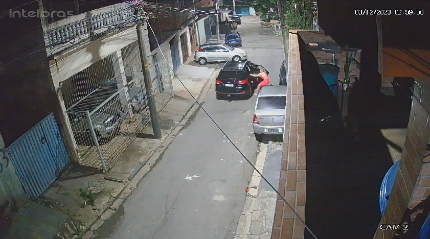 O soldado Thiago entrou no carro e deu meia volta com o veículo, mas para novamente e começa a tentar arrastar a vítima até o veículo.