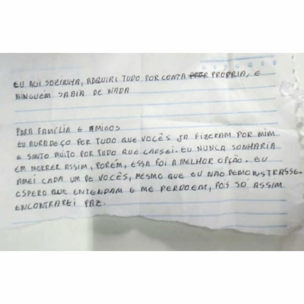 A polícia encontrou uma carta escrita pela autora, indicando intenções suicidas e pedindo perdão à família. Além disso, foram apreendidas a arma do crime e três facas que estavam com ela.