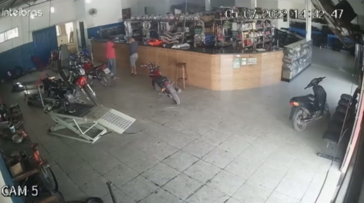 Nas imagens registradas pelo circuito interno de segurança do local onde ocorreu o crime, podemos ver o momento em que o homem, que aparece usando uma camisa vermelha, se aproxima de Evandro e inicia uma discussão. Neste momento, o suspeito já apontava o facão para a vítima.