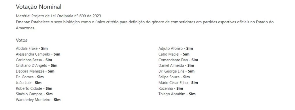 Com a aprovação unânime, o PL segue para a sanção ou veto do governador do Amazonas, Wilson Lima (União Brasil). A iniciativa tem como objetivo impedir que atletas trans compitam contra indivíduos do sexo oposto biologicamente em competições esportivas oficiais.