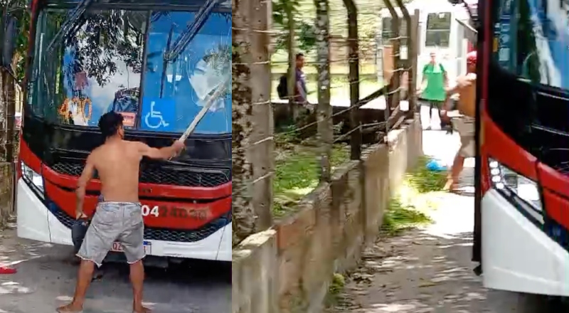 Nas imagens, o homem aparece visivelmente transtornado e sem camisa. Utilizando uma ripa de madeira de grande porte, ele desfere vários golpes violentos contra o vidro dianteiro do coletivo. O impacto é tão forte que o para-brisa do lado do motorista fica completamente estilhaçado em poucos segundos.