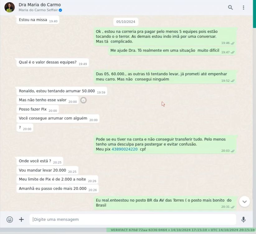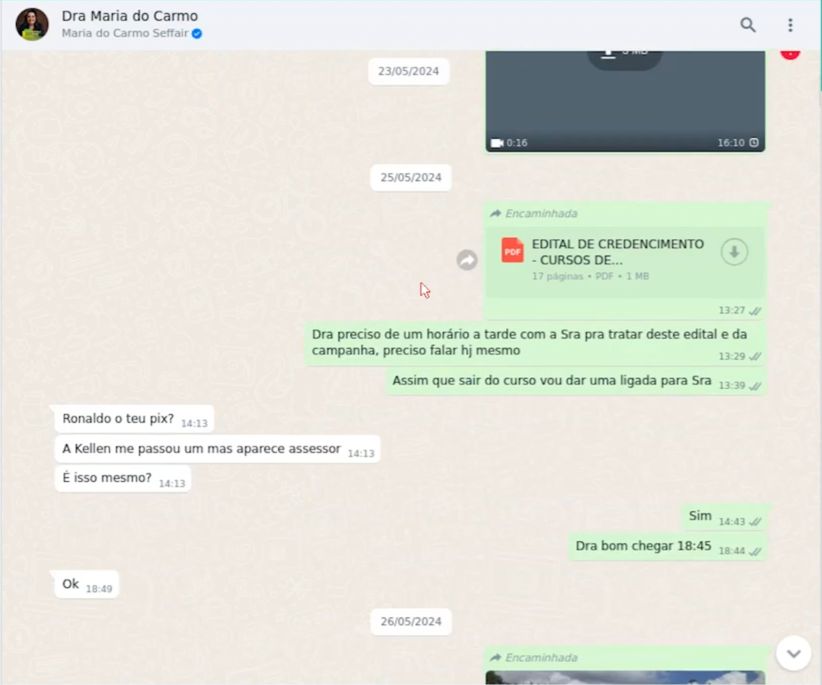 Analisando os extratos e conversas obtidas, ficou claro que Ronaldo estava sendo abastecido financeiramente por Maria do Carmo. Em uma conversa no dia anterior ao primeiro turno da eleição, ela escreve: “Ronaldo, estou tentando arrumar 50.000. Mas não tenho esse valor. Posso fazer Pix”. No dia seguinte, ela transferiu R$ 22 mil da conta do Centro de Estudos Jurídicos do Amazonas para a conta pessoal de Ronaldo, como havia prometido.