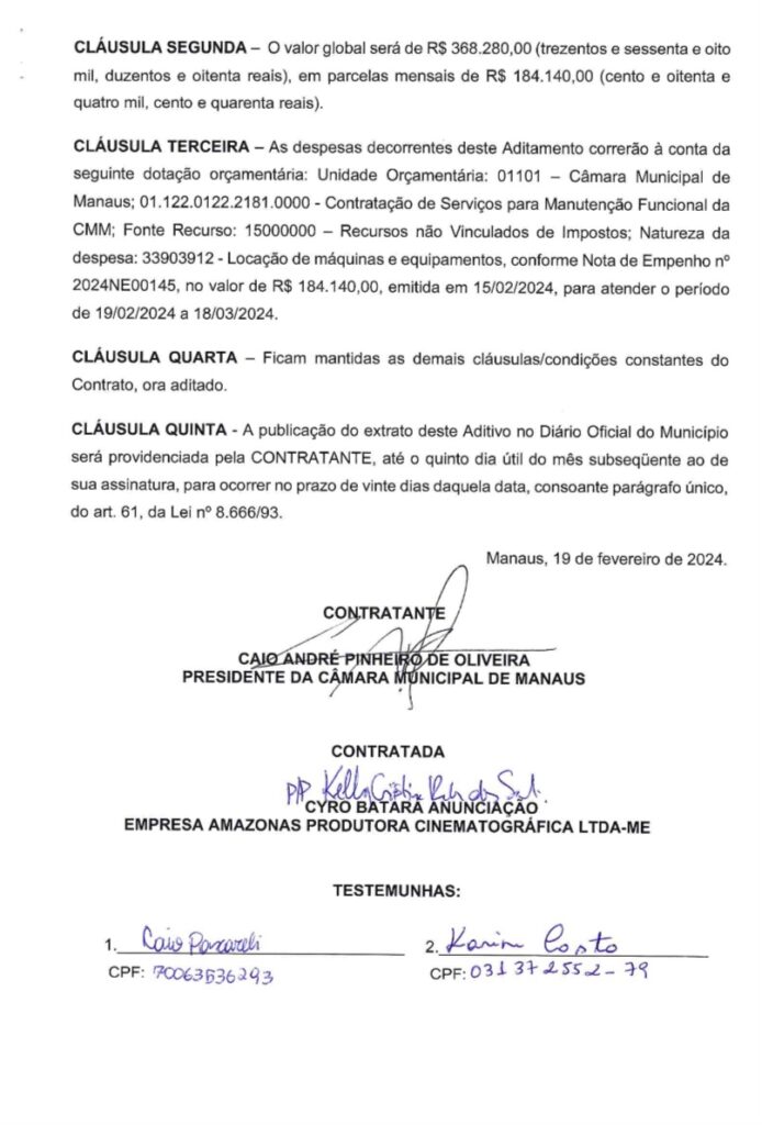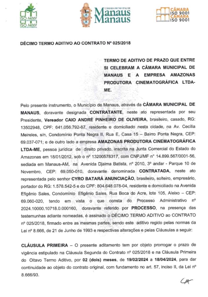 A Câmara Municipal de Manaus (CMM), já pagou em aditivos de contrato para a empresa Amazonas Produtora Cinematográfica LTDA-ME de Cyro Batará Anunciação, até março deste ano, o montante de R$ 736.560,00. O valor é a somatória dos quatro primeiros meses do ano, em um contrato que encerra no dia 18/04/2024.