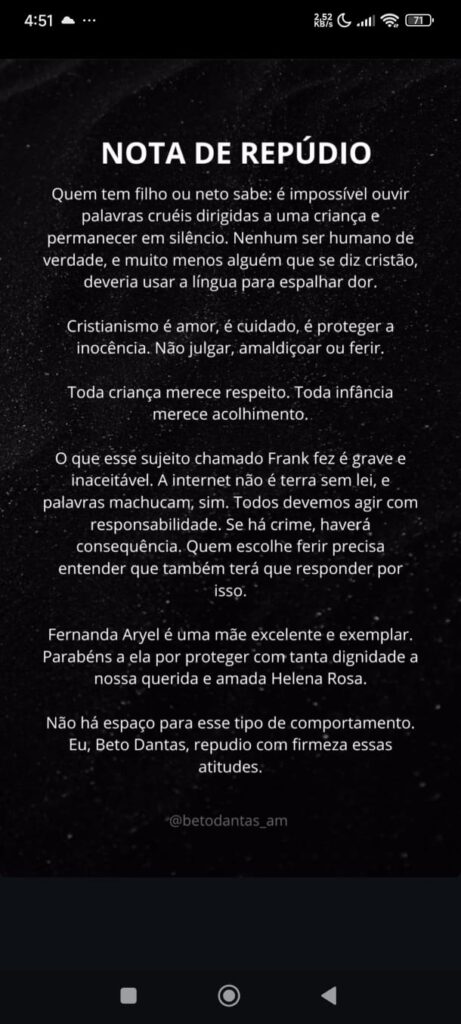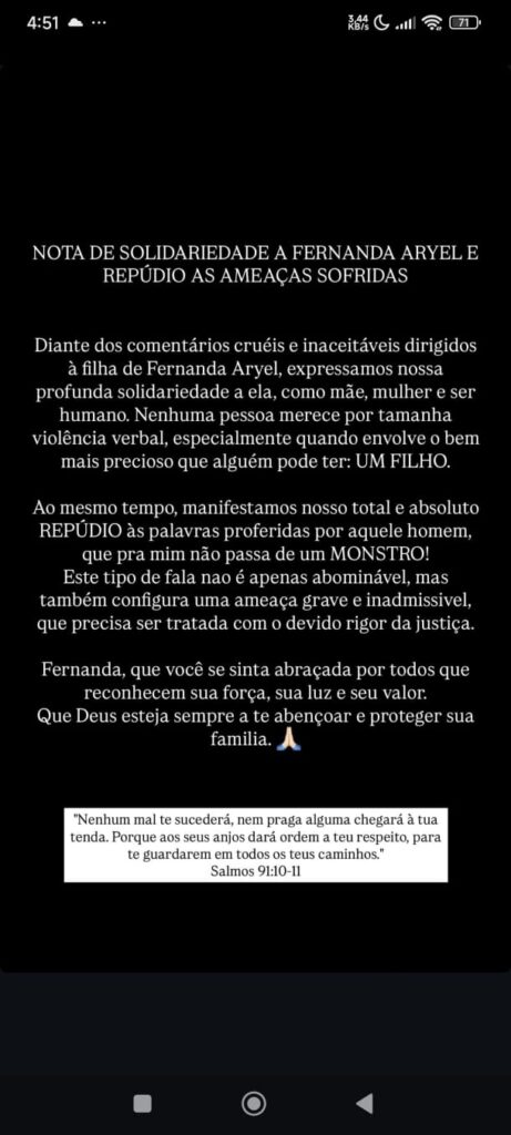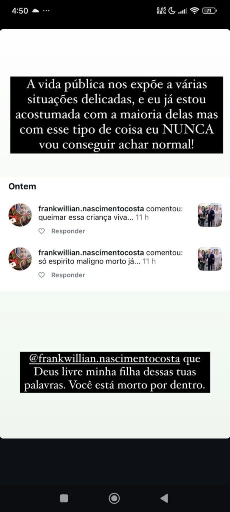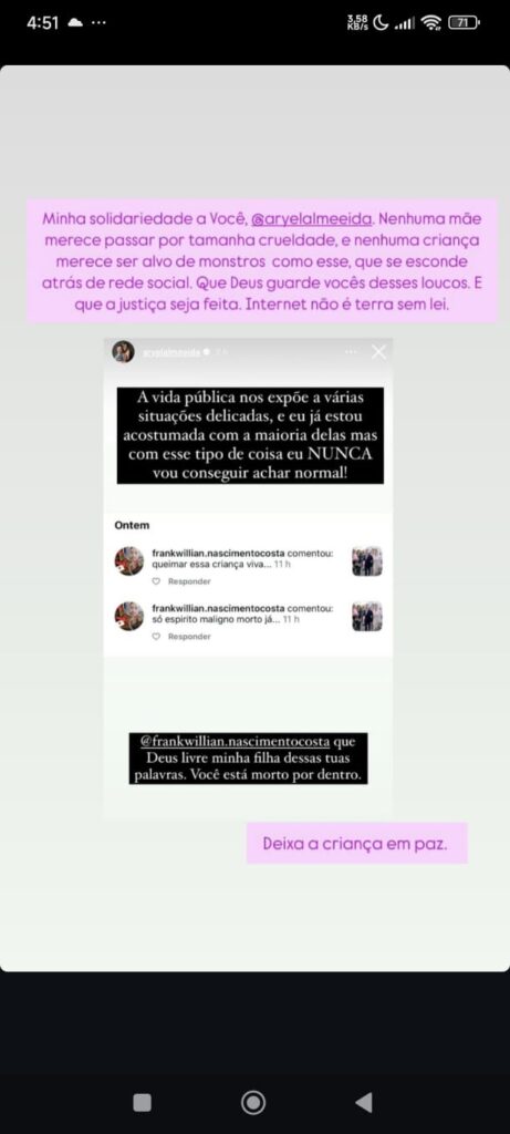 O perfil Frank William Embraer fez os seguinte comentários contra a bebê: “queimar essa criança viva” e ainda “só espírito maligno morto já”. Fernanda, que frequentemente lida com críticas devido à sua visibilidade pública, reagiu com firmeza, destacando que não aceitará ameaças contra sua família, especialmente contra sua filha.