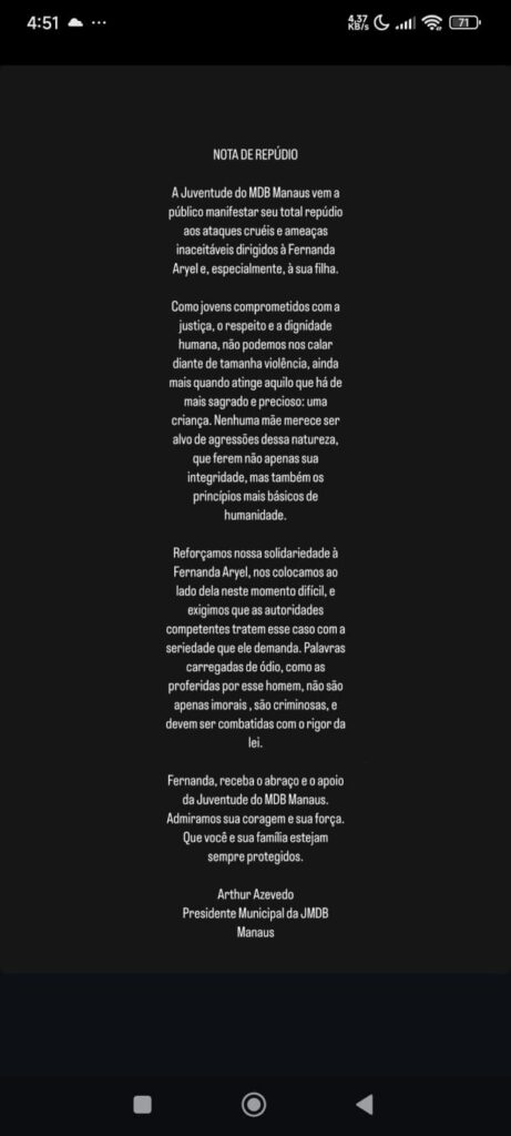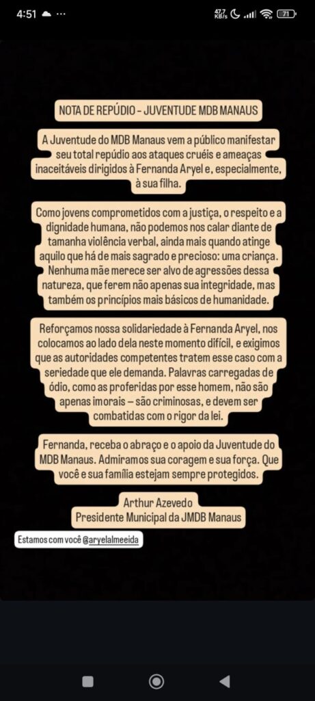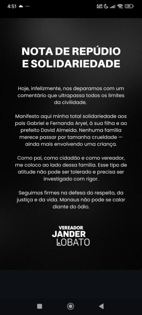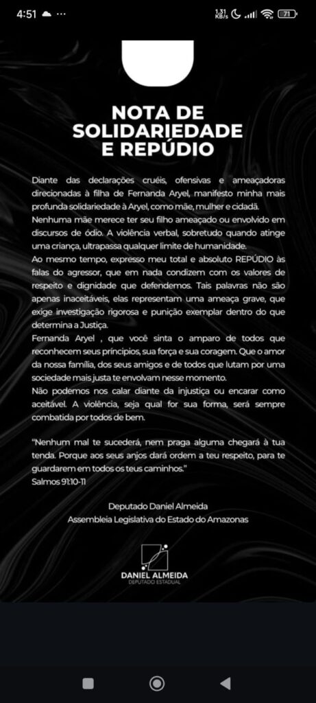 Manaus – Comentários ameaçadores direcionado à filha de Fernanda Aryel, filha do prefeito de Manaus, David Almeida (Avante), chocaram a sociedade nesta quinta-feira (17). O caso reacendeu o debate sobre os limites da liberdade de expressão nas redes sociais. A mensagem, carregada de ódio, fazia alusão à criança de forma cruel, gerando indignação e uma onda de apoio à família.