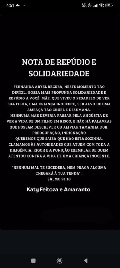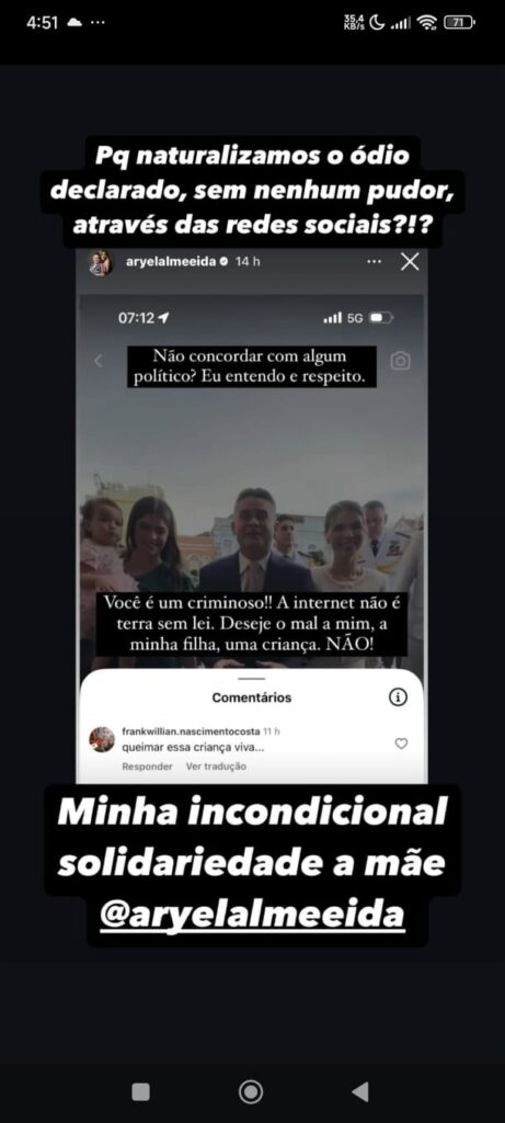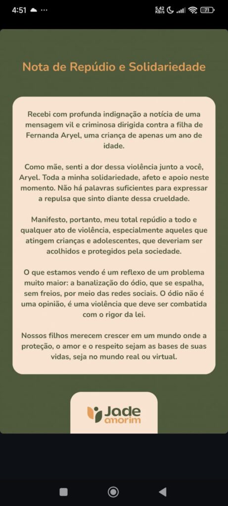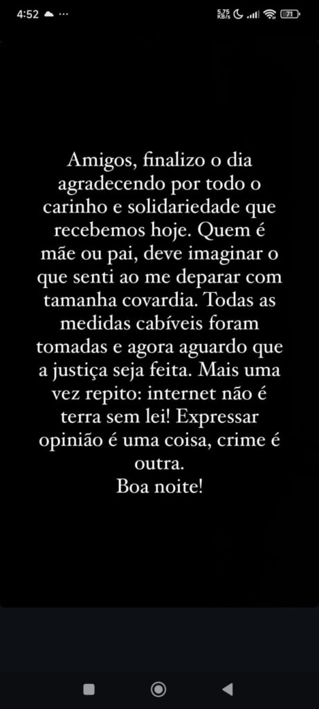 “Não aceito que desejem mal à minha família. A internet não é terra sem lei”, declarou Fernanda, reforçando a gravidade do ataque. Ela fez questão de diferenciar discordâncias políticas, que considera naturais, de atos criminosos como o que vitimou sua filha. “Respeito quem pensa diferente, mas desejar morte a uma criança é inadmissível”, afirmou, em um apelo por maior responsabilidade no ambiente virtual.