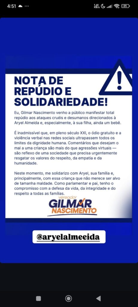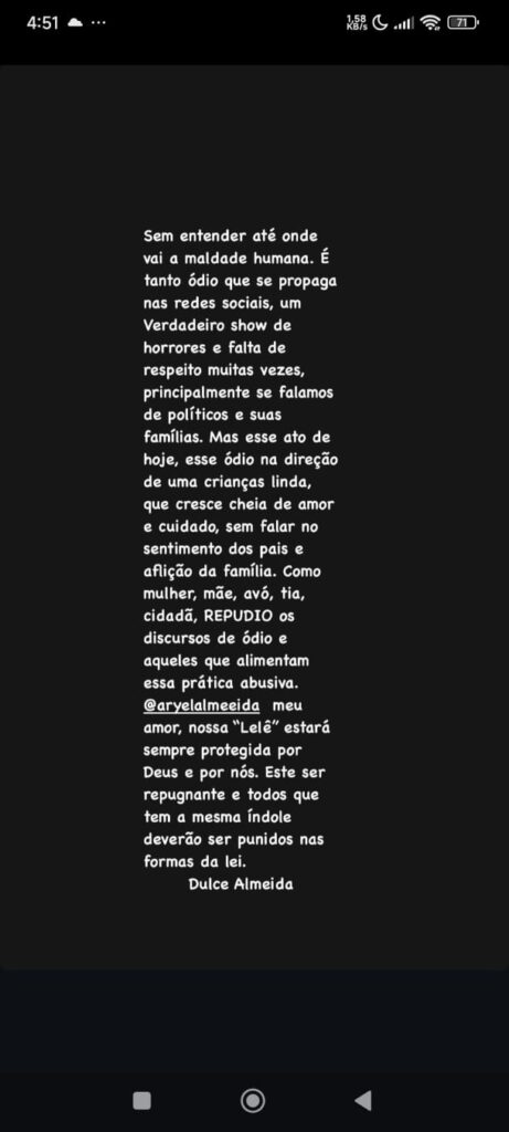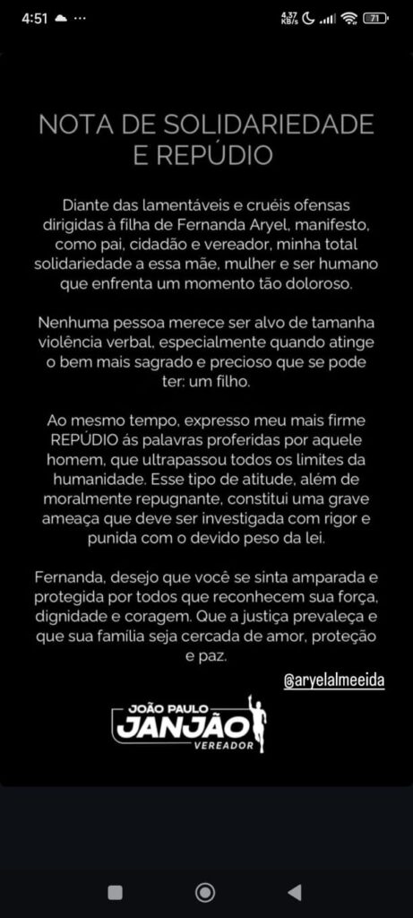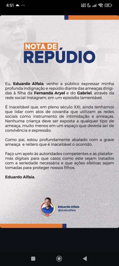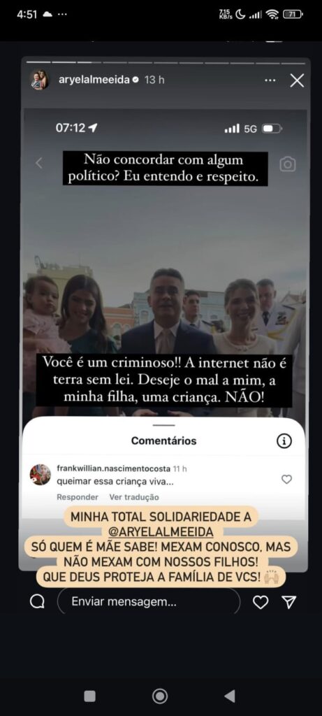 O caso gerou forte repercussão nas redes sociais, com manifestações de apoio de políticos, advogados e amigos. O deputado estadual Daniel Almeida, tio de Fernanda, emitiu uma nota repudiando o ataque. “Nenhuma mãe merece ter seu filho ameaçado. A violência verbal contra uma criança é inaceitável”, declarou o parlamentar, cobrando uma apuração rigorosa do caso. A onda de solidariedade reflete a indignação coletiva diante da violência virtual direcionada a uma criança.