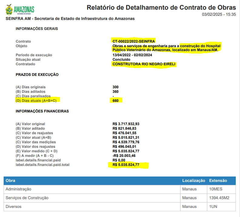 Um documento recentemente revela que o total já gasto na obra do Hospital Público Veterinário de Manaus alcançou a marca de R$ 5.035.824,77, valor consultado em 2025. Esse montante reflete os sucessivos aumentos nos custos da construção, que já ultrapassaram o orçamento inicial de R$ 3,7 milhões.
